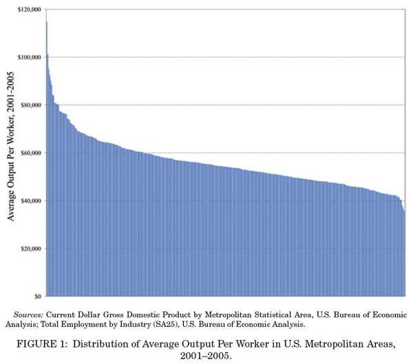 The graph above, from the study, shows the wide variation in productivity across U.S. metros. The most productive metro generated $114,798 in average output per worker, more than three times that of the least productive ($35,867). As the authors point out, the “average output per worker in the twenty most-productive metropolitan areas was two times larger than in the twenty least-productive metropolitan areas, and more than one-half larger than the value for the median metropolitan area…”