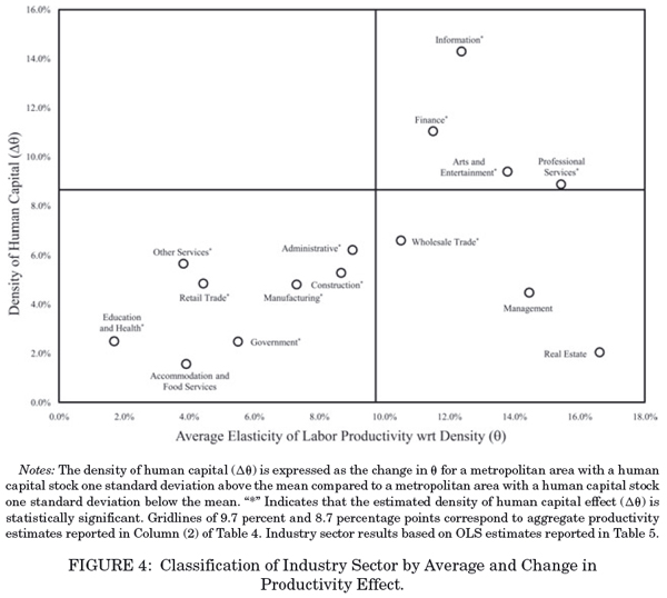 [T]he most interesting findings from our paper are that (1) the effect of density on productivity is practically zero (or even negative) in low-human capital metros, but the effect of density on productivity is quite substantial in metros with high college attainment shares; and (2) the interaction effects of population density and college attainment on productivity are highest for the industrial sectors of information, finance, arts and entertainment, and professional services—sectors that place a high premium on creativity and sharing of ideas.