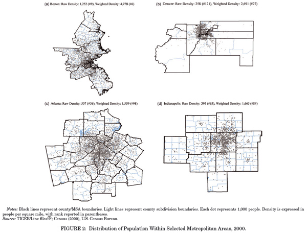 “[These maps] really show the difference (especially for places like Denver) between the ‘standard’ density measure (population per square mile) and the weighted density measure,” writes Gabe in an email. It’s a concept we recently explored on Cities.