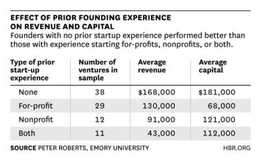 Digging a little deeper, it doesn’t seem to matter whether these experienced founders had started nonprofit organizations or for-profit companies. In fact, those ventures that had both kinds of entrepreneurial experience on their team produce lower commercial performance.