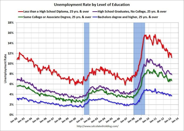 From Bill McBride at Calculated Risk, here’s the latest look at the differing levels of unemployment by level of educational attainment.