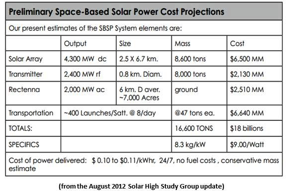 The delivered cost of power from SBSP, according to August 2012 calculationsby NASA Apollo program engineer Philip Chapman, would be $0.10 to $0.11 per kilowatt-hour.
