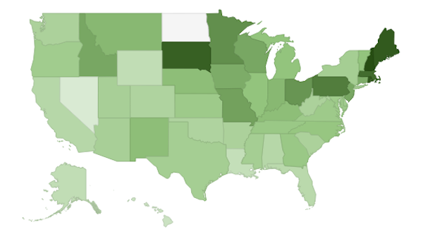 Here are two quick visual ways to see vast geographical variations in student borrowing. In dark green states below, public college undergrads borrow more frequently (notice New Hampshire in that handsome shade of seaweed). In lighter green states, they borrow less often. (North Dakota, in white, sadly lacked data).