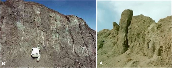 From the position of the object in the middle of an obvious mud flow, it is obvious that the object slid down more than a mile from its original location. Geologists believe it was originally over 1000 feet higher in the mountain and encased in a shell of hardened mud. They think that an earthquake in 1948 cracked the mud shell and revealed the structure. This is confirmed by stories from the surrounding villagers who tell of its “sudden appearance” around that time.