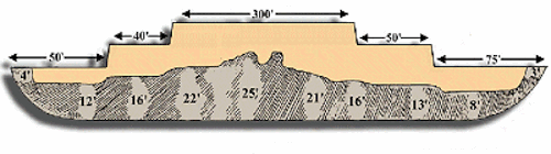 The first part of the survey was to examine the object and take its measurements. The shape looked like hull of a ship. One end was pointed as you would expect from bow [below: D] and the opposite end was blunt like a stern. The distance from bow to stern was 515 feet, or exactly 300 Egyptian cubits. The average width was 50 cubits. These were the exact measurements mentioned in the Bible.