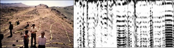 The team of geologists didn’t scan the entire object. Instead, they marked out lines that crossed the object with yellow tape. Then they dragged the antenna (about the size of a lawnmower) over the lines and watched the output on the paper recorder. When they got a strong “hit” — meaning there was something solid underneath — they would record the position on the tape [above]. Later, when they made a map of the object, the tape and the location of the “hits” they realized that there was indeed a structure underneath the mud.