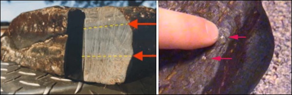 Using the GPR, Ron Wyatt discovered an open cavity on the starboard side. He used an improvised drill to make core sample inside this cavity and retrieved several very interesting objects. Below you can see the artifacts which were sent for laboratory analysis. On the left is the bore hole [see below], followed by what turned out to be petrified animal dung, then a petrified antler and lastly a piece of cat hair.