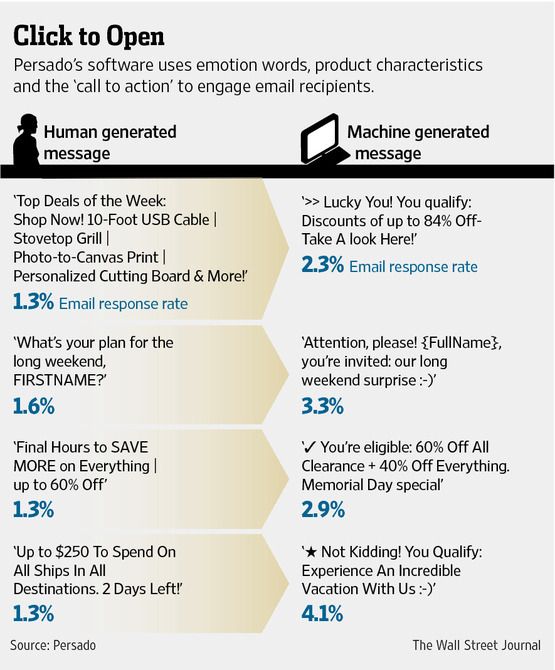 But Persado’s software deconstructs advertisements into five components, including emotion words, characteristics of the product, the “call to action” and even the position of text and the images accompanying it. By recombining them in millions of ways and then distilling their essential characteristics into eight or more test emails that are sent to some customers, Persado says it can effectively determine the best possible come-on.