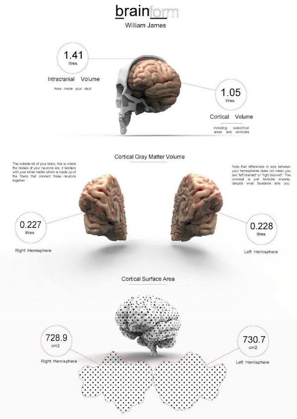 Brainform takes MRI scan files to custom-create accurate (albeit hollow, which hopefully isn’t too accurate) models of both hemispheres of the brain, though without the cerebellum or sub-cortical structures. The brains are available in full-scale and half-scale models with your choice of a white or matte grey stand, and can be displayed as a whole brain or as one hemisphere at a time.