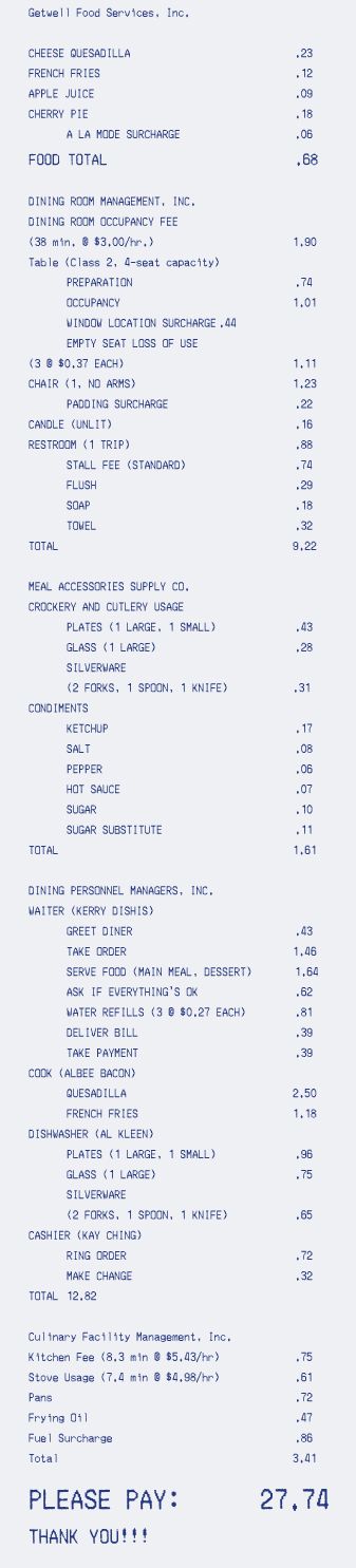 The waiter provided a greeting? That will be 43 cents. Asking if everything is okay? Another 62 cents. Serving the food would cost an additional $1.64. Anything ranging from the chair you sat in to the utensils you used and your trip to the bathroom would come with a charge.