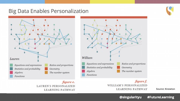 The ed-tech company Knewton focuses on creating personalized learning paths for students by gathering data to determine what each student knows and doesn’t know and how the student learns best. Knewton takes any free, open content, and uses an algorithm to bundle it into a uniquely personalized lesson for each student at any moment.