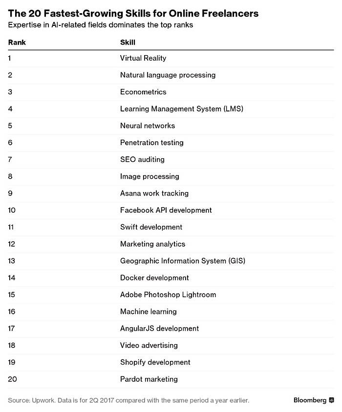 Demand for online freelancers with VR expertise grew far faster than for people with any other skill last quarter. Billings on VR projects grew more than 30-fold from the same period a year earlier, according to U.S. data provided by Upwork Inc.’s website that connects freelancers with employers.