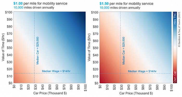 Ride-hailing services become more economic when a person’s car is more expensive and the more that person values his or her time (the blue end of the charts). The cost of transportation services now is usually between $1 per mile (left, on the above chart) and $1.50 per mile (right), but the introduction of autonomous vehicles has the potential to push prices to below $1 per hour. The intersecting lines represent the results for the median price for a new car and median wages reported to the Social Security Administration. The acronym TNC stands for Transportation Network Company.