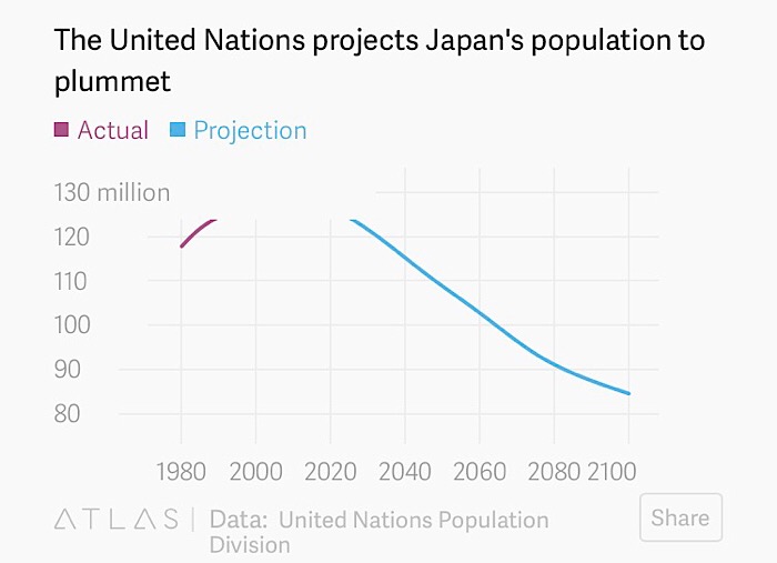 Demographers forecast a steep population decline for Japan this century. The Japanese Statistics Bureau (pdf) estimates that the Japanese population will fall to just over 100 million by 2050, from around 127 million today. The United Nations estimates that Japan’s population will decline by a third from current levels, to 85 million, by 2100. That would make it the fastest-contracting country among the world’s 30 most populous nations.