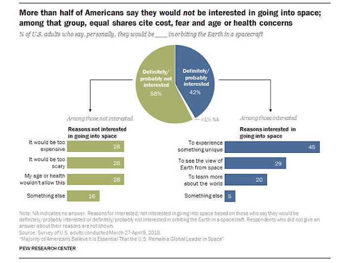 Among the 42% of Americans who would be interested in traveling into space, 45% of them say the main reason for their interest would be to “experience something unique.” Some 29% of this group say they would go so that they can see the view of Earth from space, while 20% want to “learn more about the world.”