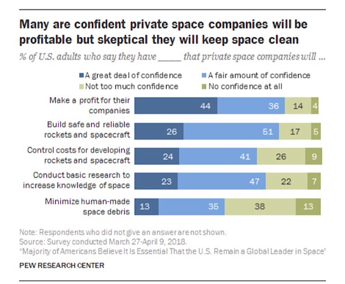 Most Americans express confidence that private space companies will be profitable, but are skeptical that those companies will minimize hazardous space debris.