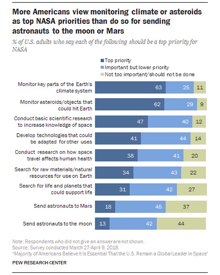 Majorities say monitoring climate or tracking asteroids should be a top NASA priority; only 13% say the same of putting astronauts on the moon.
