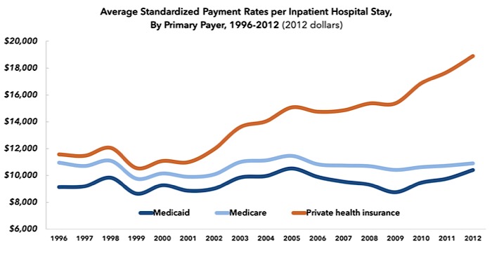 Hospitals charged private insurers 190% of what they charged Medicare in 2012.