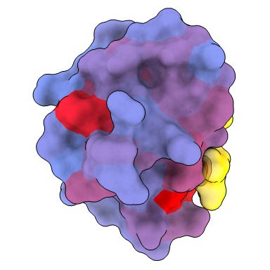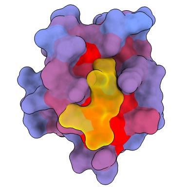 A three-dimensional image showing the human protein PSD95-PDZ3 from the front. Shown is the binding partner CRIPT (yellow) in the active site with the blue-to-red color gradient indicating increasing potential for allosteric effects. Based on PDB accession 1BE9.