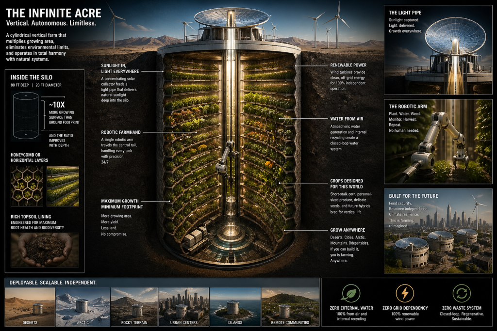 The second advantage is environmental independence. A self-contained silo with atmospheric water collection and wind power is not dependent on rainfall, soil quality, temperature range, or any of the variables that currently constrain where agriculture is possible. Deploying food production in the Sahara, the Gobi, the Arctic, or the middle of a megacity becomes an engineering question rather than an agricultural one. The implications for food security in climate-stressed, water-scarce, or densely populated regions are significant.