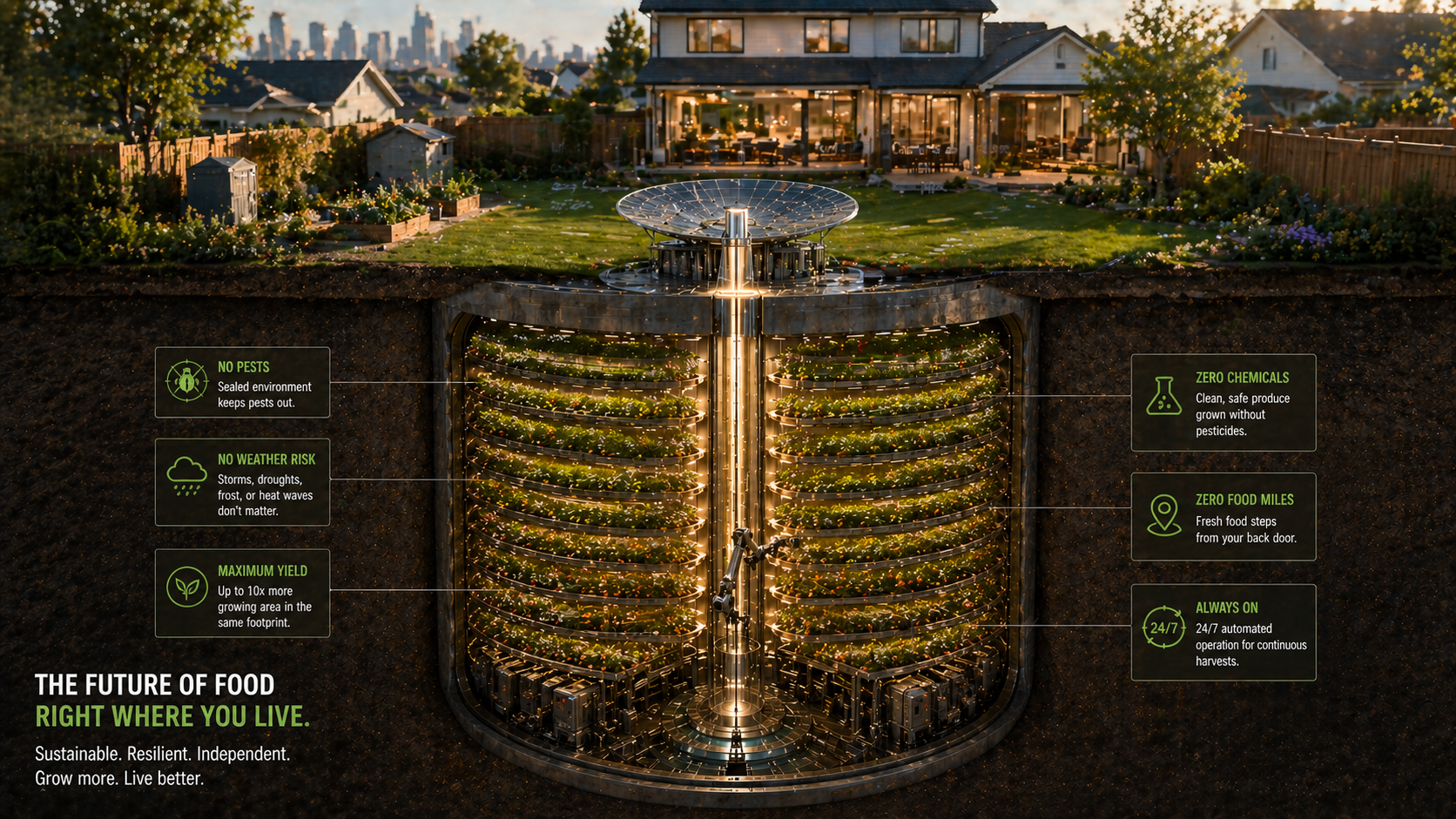 The silo farming concept as fully described — cylindrical, underground, optically lit, robotically managed, atmospherically watered — does not yet exist as a deployed commercial system. It is a conceptual architecture waiting for its moment of assembly.