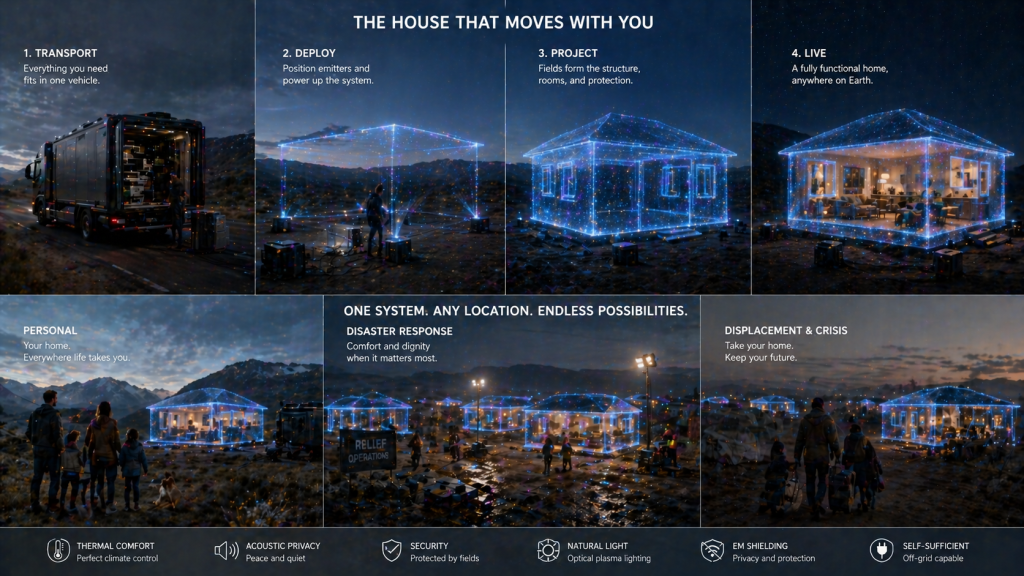 At the geopolitical level: populations displaced by conflict, by climate, by economic collapse currently face the loss of not just their location but their shelter. A projected house system that is genuinely portable changes the calculus of displacement. The shelter is not the place. The shelter is the field generator. Take the generator; keep the house.