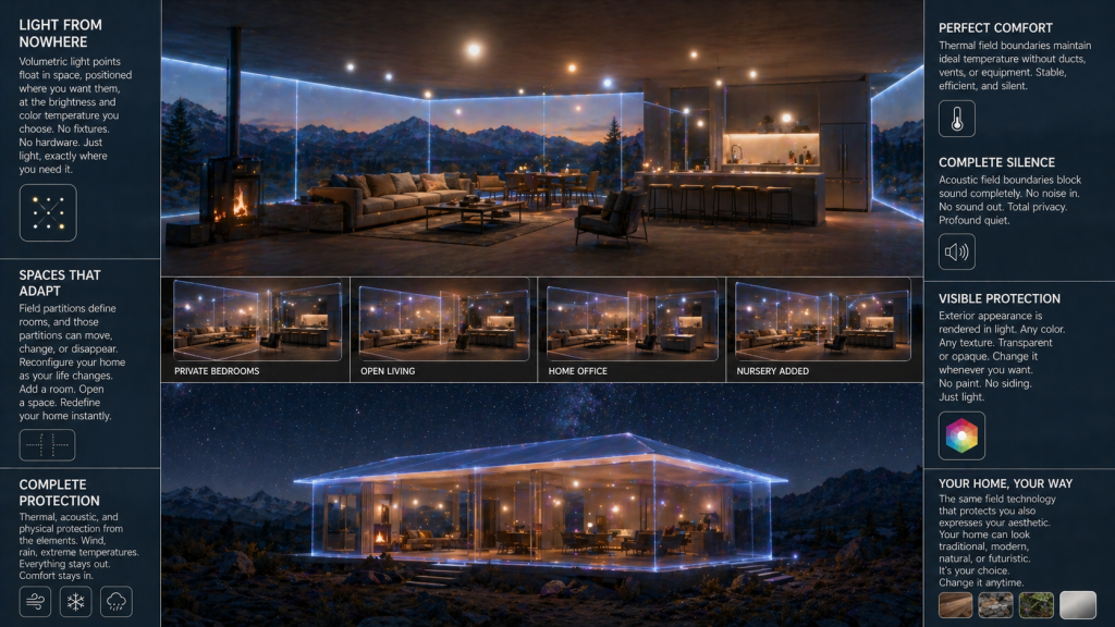 The temperature would be stable regardless of external conditions, maintained by the thermal field boundary rather than by a heating or cooling system distributing conditioned air through ducts. The silence would be profound — acoustic field boundaries are more effective sound barriers than any physical wall, because they don’t transmit vibration the way solid materials do. External noise would not enter. Internal conversations would not exit.