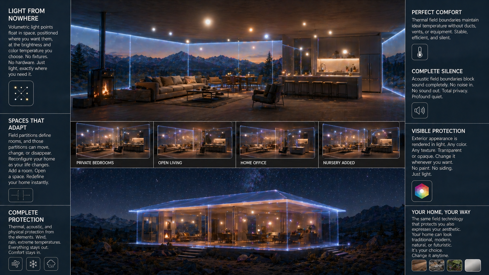 Put these together — acoustic pressure fields defining the structural boundaries, thermal isolation fields providing the insulation function, electromagnetic fields providing the shielding and privacy function, and optical plasma fields providing the lighting — and you have a building. A building with no physical substance whatsoever. A structure that is, from a functional standpoint, a house, while being, from a material standpoint, patterns of energy projected into space from emitters that could be the size of a backpack.