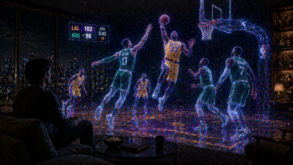 Sports leave the screen and enter your room—3D, real-time, from any angle. The data exists; volumetric displays will change how we see the game.